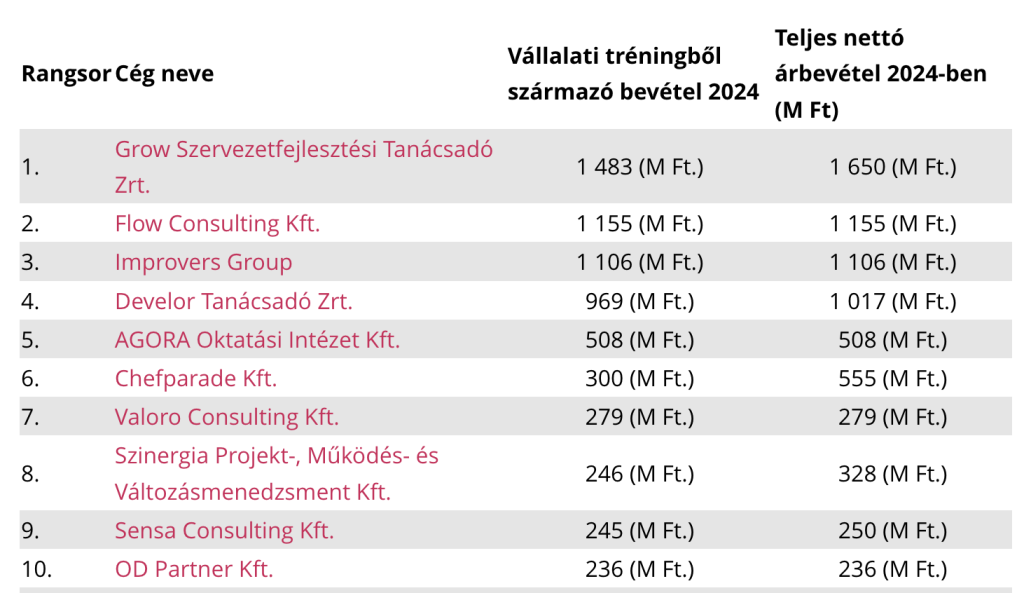 A 9. helyről az 5. helyre lépett elő a Budapest Business Journal legnagyobb tréningcégeket rangsoroló listáján az AGORA Oktatási Intézet. A cég bevételének egyre nagyobb részét képezik a piaci alapon megvalósuló megrendelések az EU-s pályázati képzések és tanácsadási projektek mellett. Az AGORA tudatosan a cégre szabott, egyedi fejlesztésű megoldásokra épít – mondta el Kaiser Eszter, tulajdonos-ügyvezető.